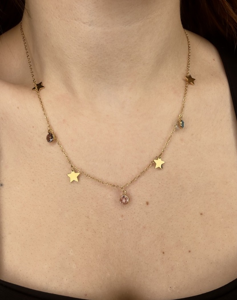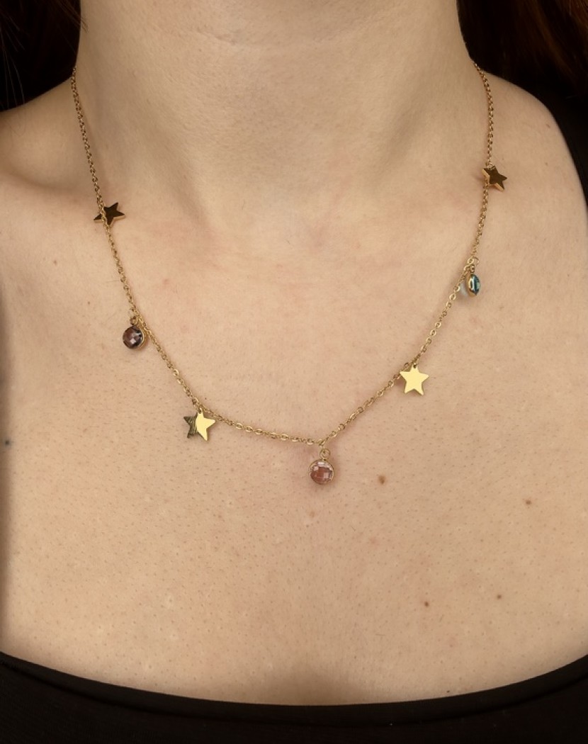 Yıldız Detaylı Renkli Taşlar Model Altın Kaplama Çelik Kolye
