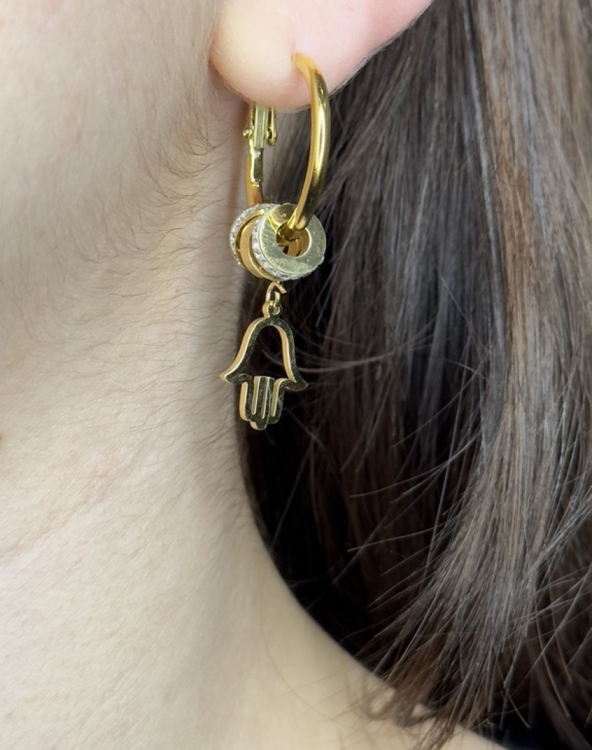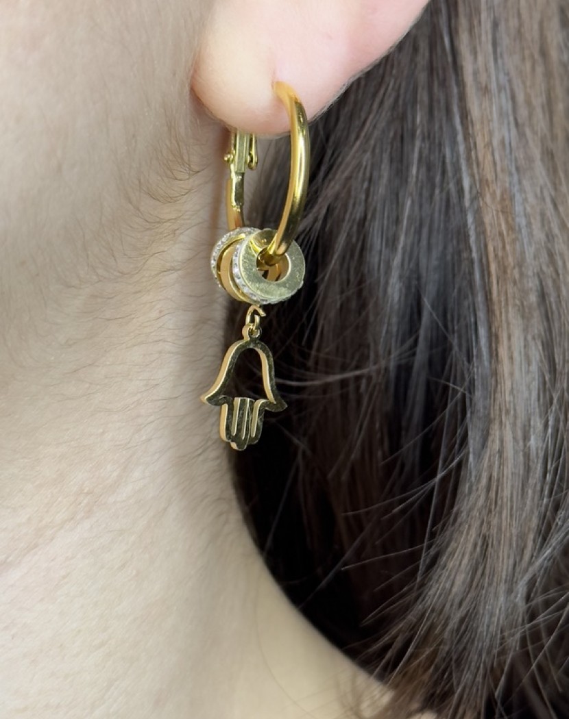 Taşlı Halka Fatma Ana Eli Model Altın Kaplama Çelik Küpe