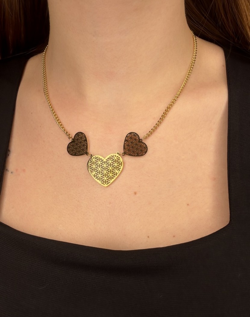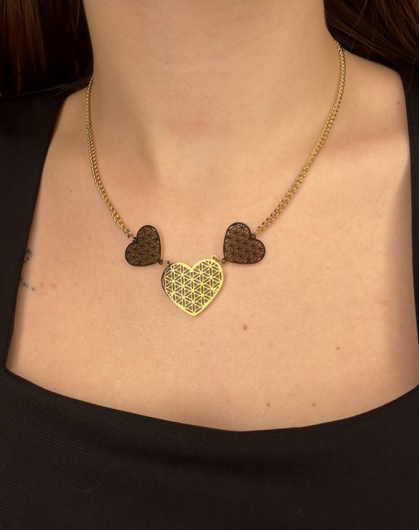 Üçlü Yaşam Çiçeği Kalpli Model Altın Kaplama Çelik Kolye