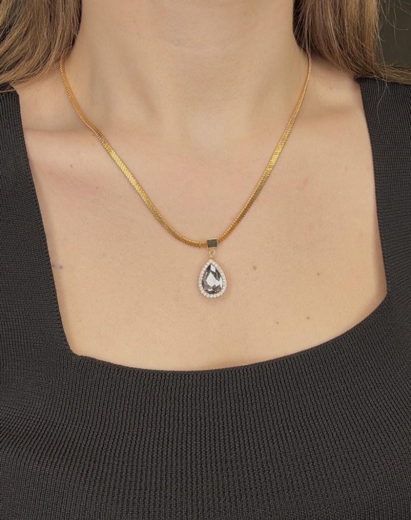 Yeni İtalyan Zincirde Taşlı Su Damlası Model Altın Kaplama Çelik Kolye