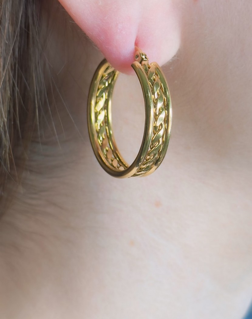 Yeni Örgü İşlemeli Model Altın Kaplama Çelik Küpe