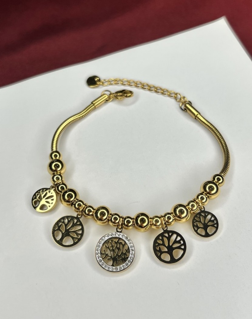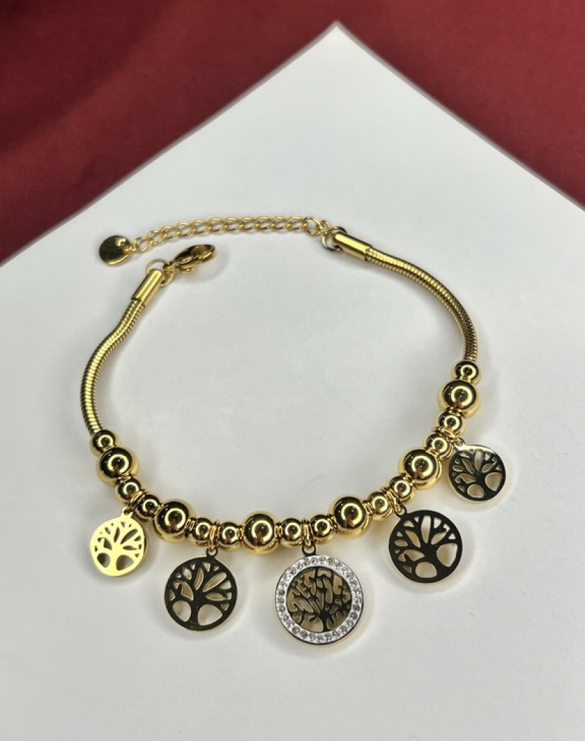 Boru İtalyan Pandra Model Yaşam Ağacı Detaylı Altın Kaplama Çelik Bileklik