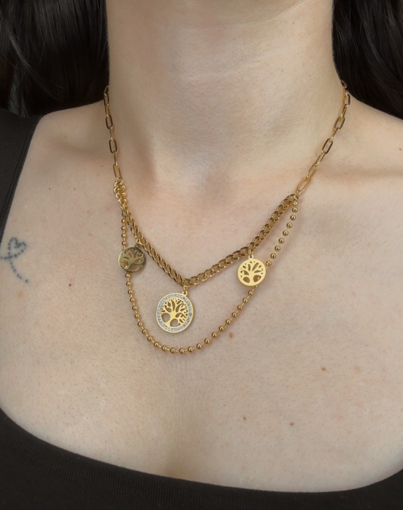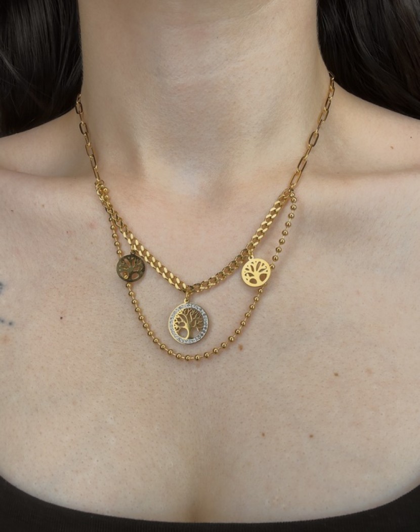 Çift Zincir Yaşam Ağaçları Model Altın Kaplama Çelik Kolye